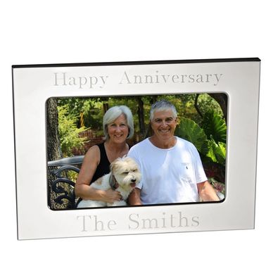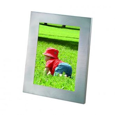 This is a brushed non tarnishing aluminum frame. It's popular for its clean lines and well suited to engraving. It features a black flocked cloth back with a 2-way easel so the frame can be used horizontally or vertically.