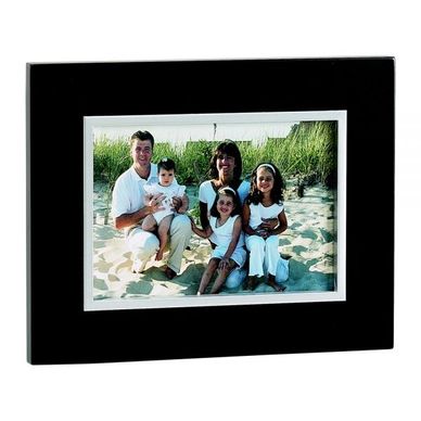 Wood photo frame in black "Ebony" finish holds " photo and features a .25" matte silver metal inner border around photo. It has a 2 way easel so the frame can stand horizontally or vertically.
