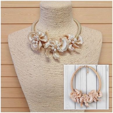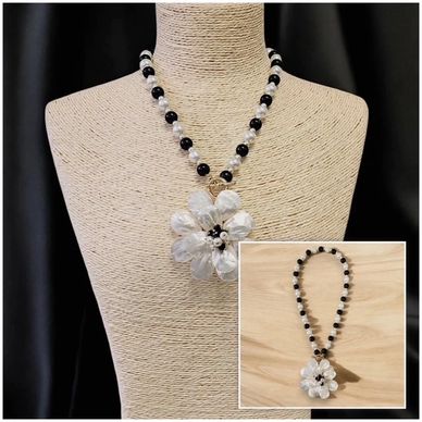 * Snakeskin-patterned cord, high-luster glass pearls, painted wood