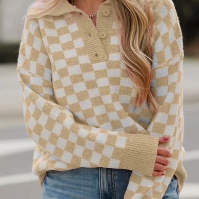 Get cozy and stylish this season with our Elaina Checkered Sweater. Stay warm and comfortable while making a statement with the trendy checkered print. The buttoned neckline and shirt collar add a touch of sophistication, while the drop shoulder design adds a relaxed and chic vibe to your outfit.