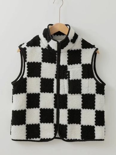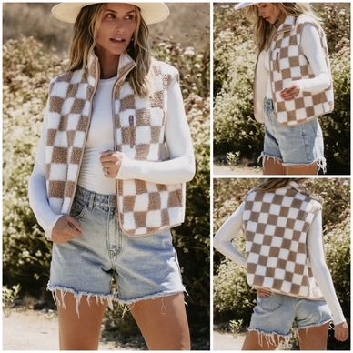 Stay cozy and stylish this winter with our Sherpa vest, crafted from ultra-soft Sherpa fabric. The trendy checkered design adds a fun twist, while the snug fit, full zipper, and stand-up collar keep you warm. Perfect for layering up on chilly days!