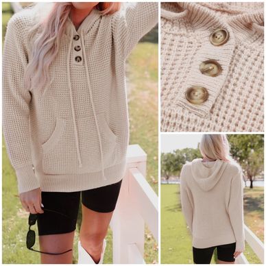 This sweater is like a cozy waffle, complete with a hood and kangaroo pocket, giving off major casual vibes. Its button-up neckline makes it simple to throw on (or take off) and the lightweight knit material makes it perfect for any occasion - whether that's a casual day out or a wild night on the town.