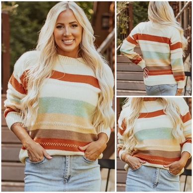 This sweater is a must-have for anyone looking to make a statement! The eye-catching stripes and vibrant colors will turn heads wherever you go. With its classic fit, it's the perfect piece to pair with your go-to jeans or skirts. Don't miss out on the fun and playful design, featuring long sleeves, a round neckline, and a mix of color blocking and stripes.